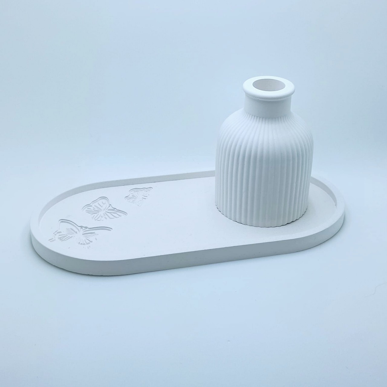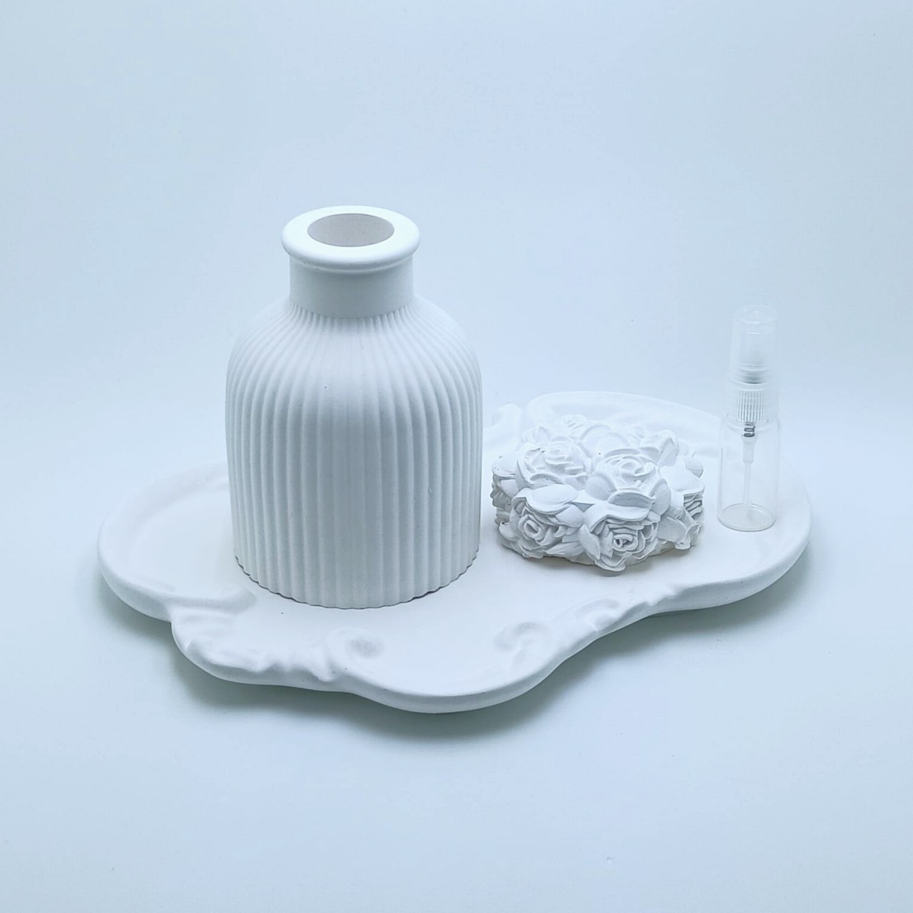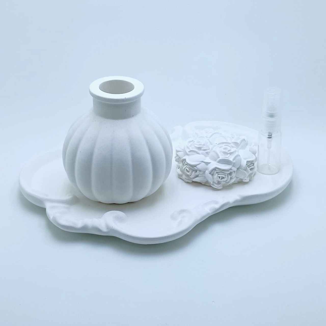 RG-46 Conjunto Decorativo + Aromatizador Aromatizadores Conjunto Decorativo: Bandeja Provençal + Vaso Canelado + Flor Aromática com Spray Elegante conjunto em gesso composto por: 1 bandeja provençal com acabamento delicado ... R$39,90