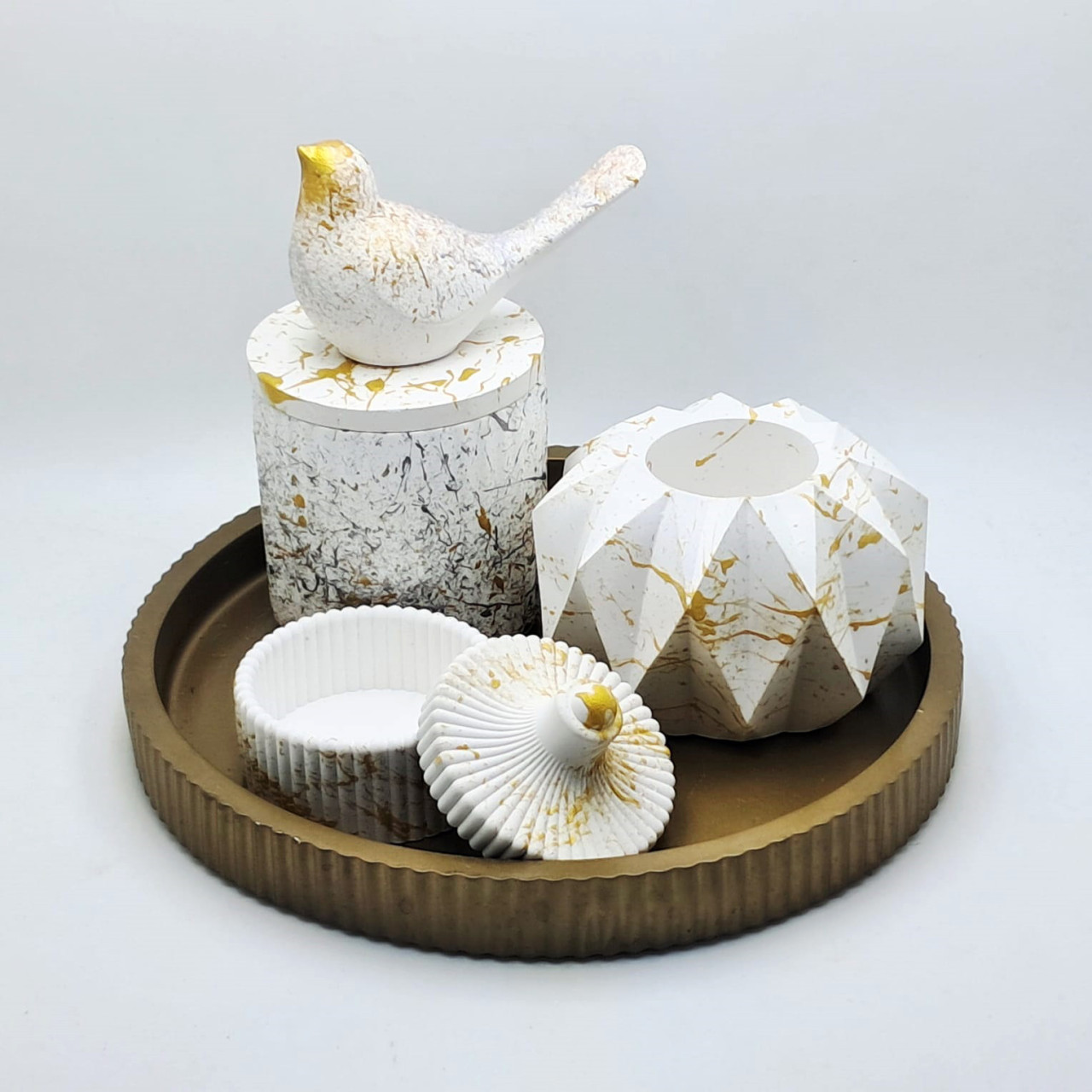 Cód. 001 Kit Bandeja Mesclada (Branco e Dourado) Vaso Tampa Passarinho Decore Home Kit Decorativo em Concreto Branco Mesclado com Dourado Conjunto elegante e moderno, produzido artesanalmente em concreto estrutural branco com detalhes mesclados em dourado, garantindo um acabament... R$99,90