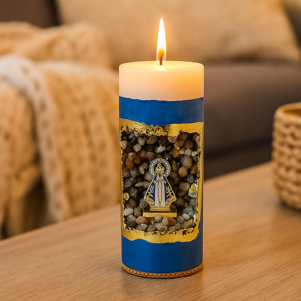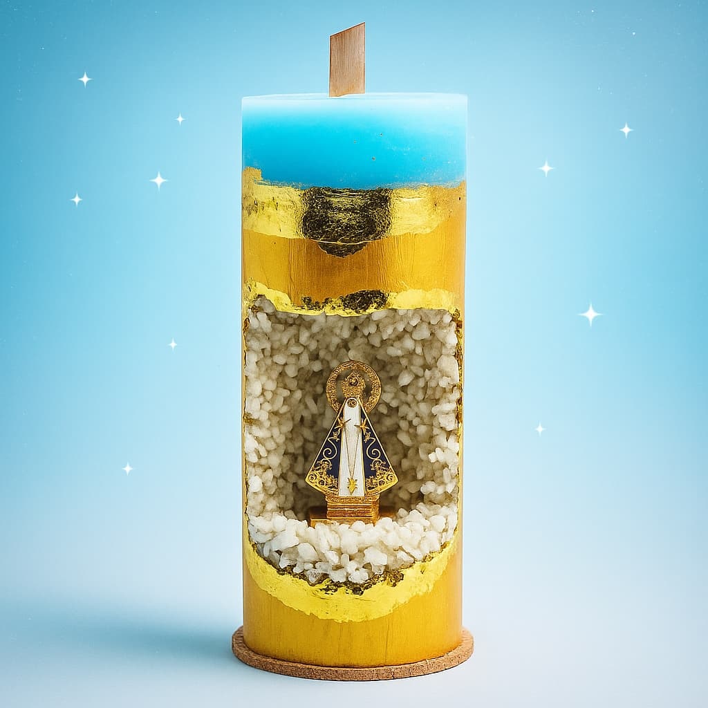 vo06 Vela Oratório (gruta azul) Dia de Nossa Senhora Aparecida Vela Oratório Nossa Senhora Aparecida Velas artesanais feitas em concreto e gesso, com detalhes em folhas de ouro 24k e uma imagem em metal de Nossa Senhora Aparecida, envolta por pedras nat... R$139,90