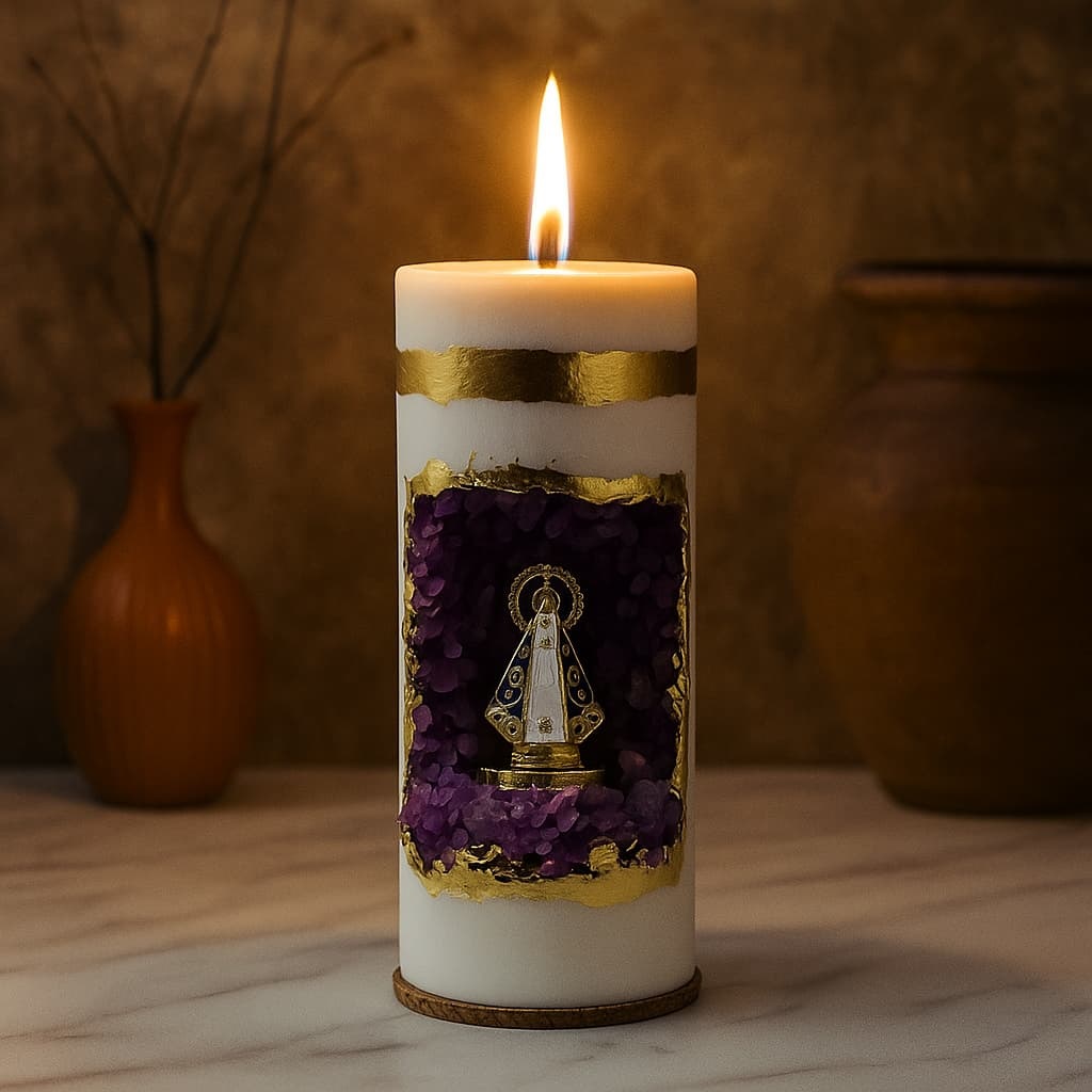 vo05 Vela Oratório (gruta lilás) Dia de Nossa Senhora Aparecida Vela Oratório Nossa Senhora Aparecida Velas artesanais feitas em concreto e gesso, com detalhes em folhas de ouro 24k e uma imagem em metal de Nossa Senhora Aparecida, envolta por pedras nat... R$139,90