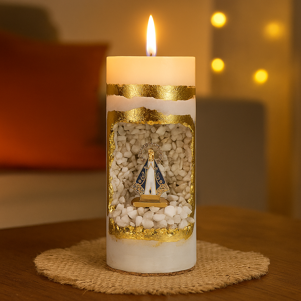 vo07 Vela Oratório (gruta branca) Dia de Nossa Senhora Aparecida Vela Oratório Nossa Senhora Aparecida Velas artesanais feitas em concreto e gesso, com detalhes em folhas de ouro 24k e uma imagem em metal de Nossa Senhora Aparecida, envolta por pedras nat... R$139,90