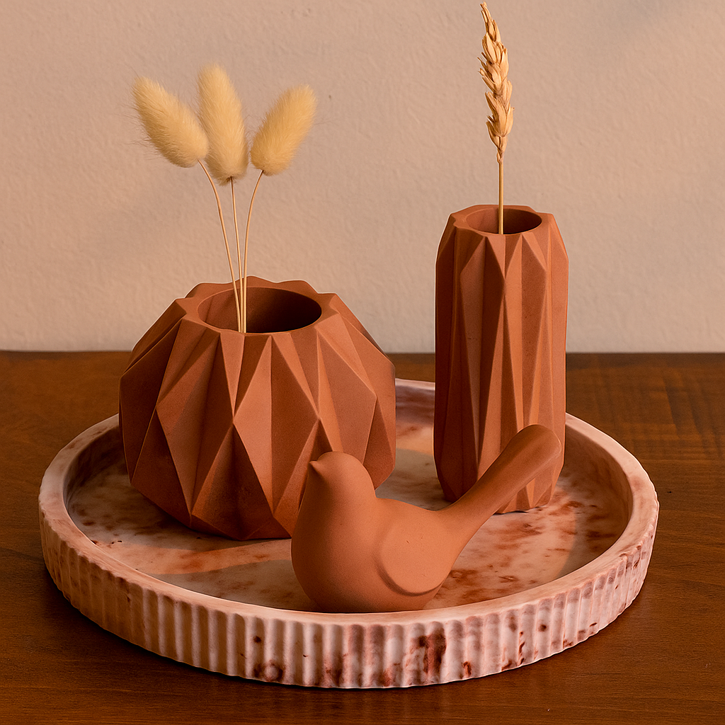 terracota Kit Bandeja + Vasos + Pássaro - (Mesclado terracota) Decore Home Kit Decorativo com Bandeja Canelada e Vasos Assimétricos – Terracota e Cimento Branco Encante sua decoração com este lindo kit decorativo composto por uma bandeja redonda... R$99,90