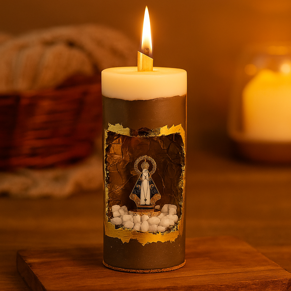 vo03 Vela Aratório (gruta prateada) Dia de Nossa Senhora Aparecida Vela Oratório Nossa Senhora Aparecida Velas artesanais feitas em concreto e gesso, com detalhes em folhas de ouro 24k e uma imagem em metal de Nossa Senhora Aparecida, envolta por pedras nat... R$139,90