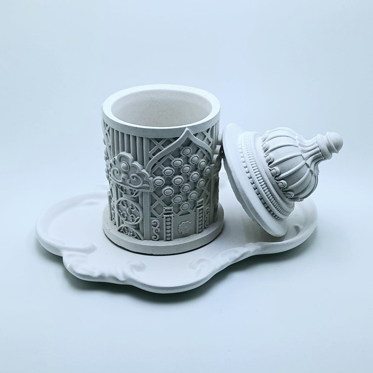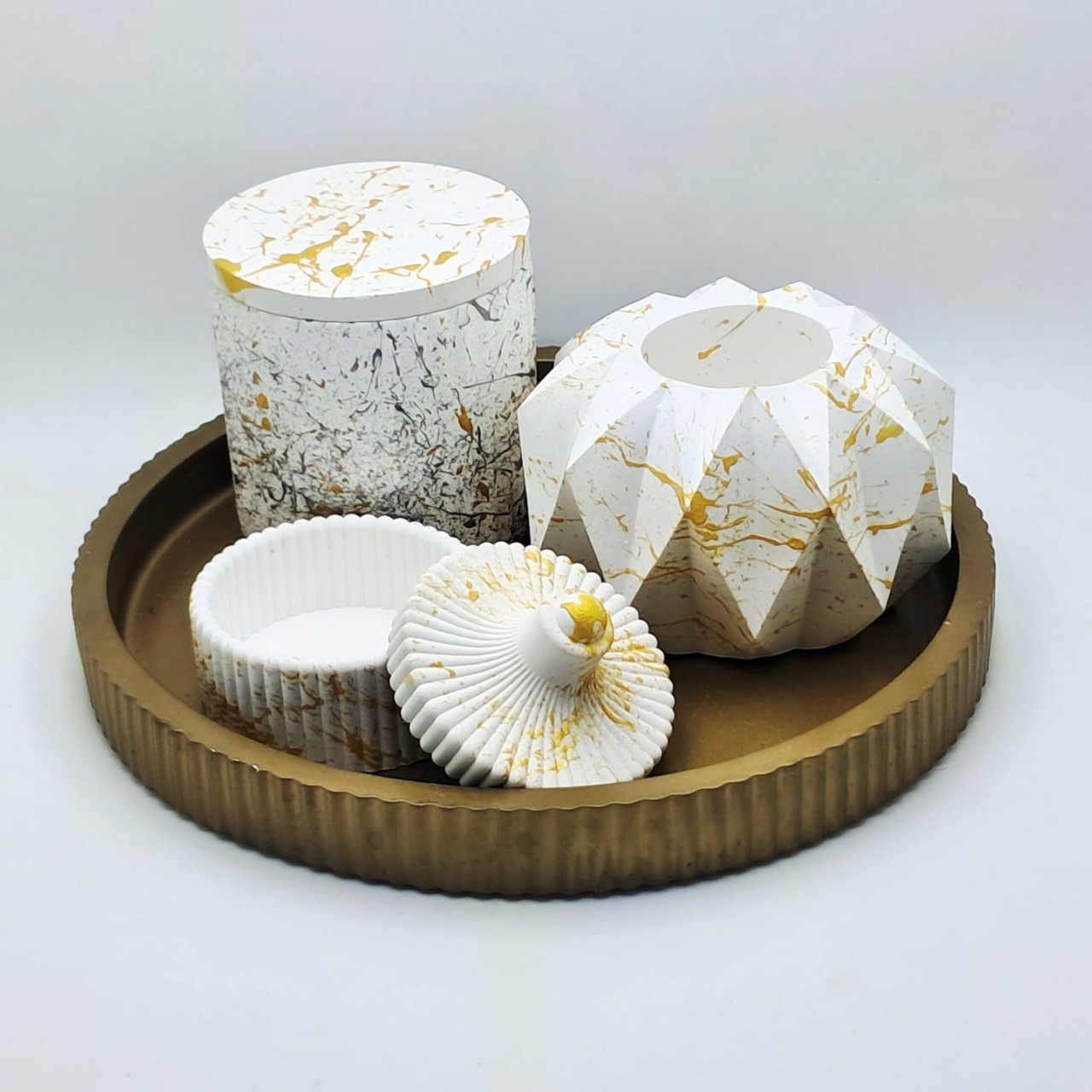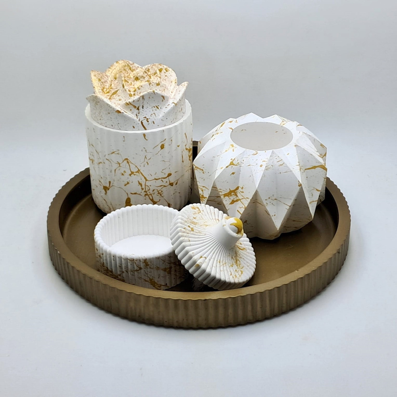 Cód. 001 Kit Bandeja Mesclada (Branco e Dourado) Vaso com Tampa Decore Home Kit Decorativo em Concreto Branco Mesclado com Dourado Conjunto elegante e moderno, produzido artesanalmente em concreto estrutural branco com detalhes mesclados em dourado, garantindo um acabament... R$99,90