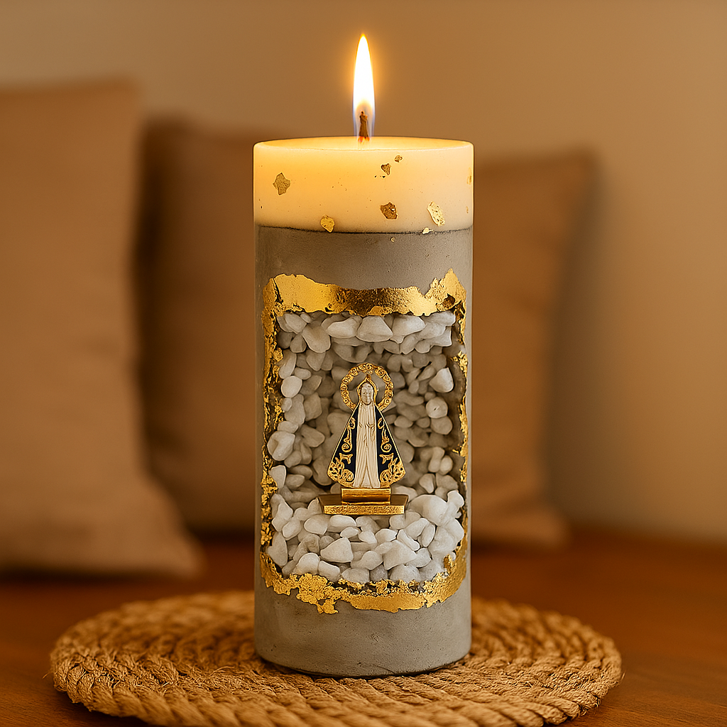 vo01 Vela Aratório (gruta cimento cru) Dia de Nossa Senhora Aparecida Vela Oratório Nossa Senhora Aparecida Velas artesanais feitas em concreto e gesso, com detalhes em folhas de ouro 24k e uma imagem em metal de Nossa Senhora Aparecida, envolta por pedras nat... R$139,90