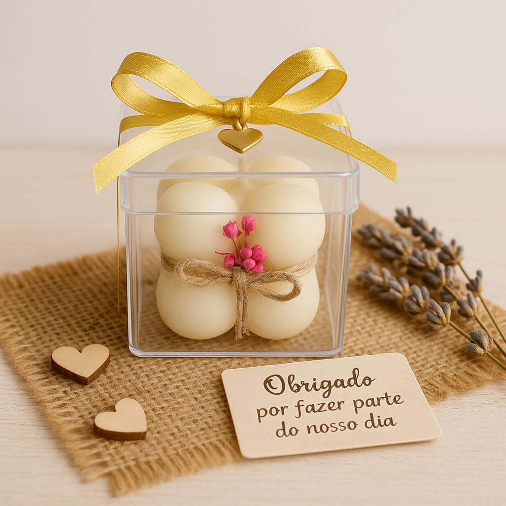 Cód. 001 Mini Vela Bubble (05 unidades) 15 anos Vela Aromática Bubble – Lembrancinha Personalizada Charmosa e cheia de estilo, nossa vela aromática em formato Bubble é perfeita para lembrancinhas em geral: aniversá... R$49,50